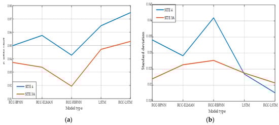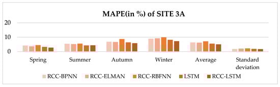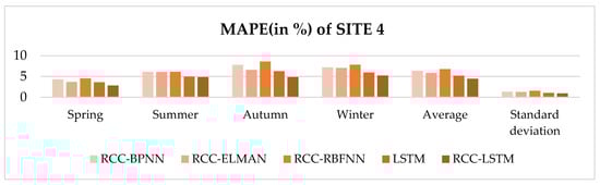 As seen in Figure 13 and Figure 14, and compared with four other models, in SITE 3A, the average MAPE of the presented model reduced by 28.70%, 23.30%, 43.40%, and 9.67%, respectively. In SITE 4, the presented model’s average MAPE improvement relative to the compared four models is 44.04%, 31.31%, 53.11%, and 18.40%, respectively.