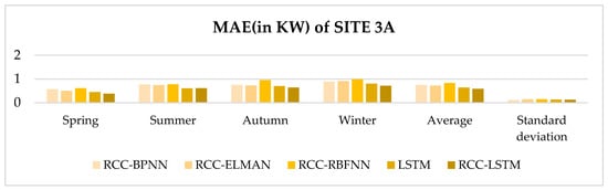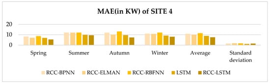 Figure 15 and Figure 16 show the MAE results of two PV systems, in SITE 3A, the presented model’s average MAE improvement relative to the compared four models is 27.30%, 23.15%, 41.93%, and 9.34%, respectively. In SITE 4, the presented model’s average MAE improvement relative to the compared four models is 45.29%, 32.10%, 53.83%, and 19.06%, respectively.