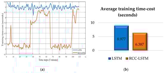The environment framework of this experiment is TensorFlow, which is implemented based on Python3.6 and a 64-bit operating system personal computer with Intel (R) Core (7M) i5-7300HQ CPU@2.50GHZ 2.50GHZ and 8.00GB of RAM. As shown in Figure 18, the average training time-cost at the different time points and the average runtime of every time point are shown in Figure 18a,b, respectively. Owing to the same time periods collection strategy of the training set, the dataset of training is small. Thus, every real-time predict step only requires a few seconds, which is acceptable in practical applications. Furthermore, due to the training dataset of RCC-LSTM that selected by RCC, compared with LSTM model, the RCC-LSTM not only improves the accuracy of the prediction but also reduces the training time cost of the prediction model. The average training time-cost of RCC-LSTM is 28.84% lower than that LSTM, and the runtime will be much lower by improving the hardware environments or optimizing code.