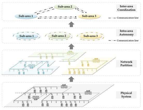 (1) An ADN partitioning method centered on SOPs is proposed. Traditional partitioning strategies consider DGs as the partition centers or SOPs as the boundary. In comparison, taking SOP as the center of the sub-area could utilize its powerful control ability on the nodes and branches in the sub-area as deeply as possible, as well as reduce the computational burden more reasonably.