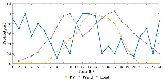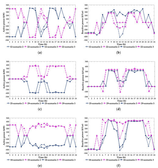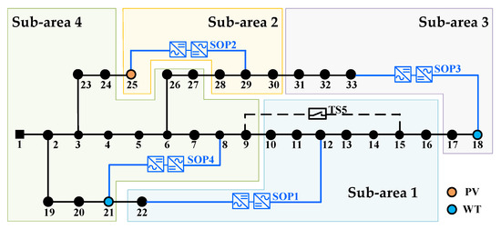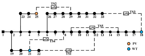 Figure 3 exhibits the modified IEEE 33-node system [30], of which the rated voltage level is 12.66 kV. The total active and reactive power loads of the system are 3715 kW and 2300 kVar, respectively. One PV and two WTs are integrated into the system. Table 1 presents the detailed installation parameters of DGs.
