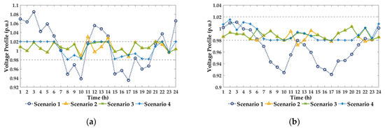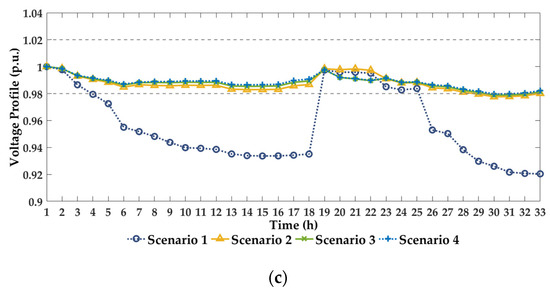 Figure 7 displays the values of nodal voltages, and Figure 8 shows the operation strategies of four SOPs. Table 3 presents the optimization results of the four scenarios. In scenario 1, there is severe voltage violation in the system without the control of SOPs. From Figure 7a, voltage magnitudes at node 18 exceed both the upper and lower desired level initially in scenario 1. Then, after the intra-area autonomous control in scenario 2, voltage violation is significantly mitigated. The operation strategies of SOPs are modified further by inter-area coordination through boundary information interaction in scenario 3 when voltage violations still occur, namely, in time periods 6, 10–14, 17, and 22, as shown in Figure 8. After the coordination in scenario 3, voltage profiles perform much better and more closely approximate the global optimization in scenario 4, as established in Figure 7c. Therefore, given that the proposed method in scenario 3 is based on less measurement information, the proposed decentralized control strategy of SOPs can effectively mitigate voltage violations without a huge communication and calculation burden.