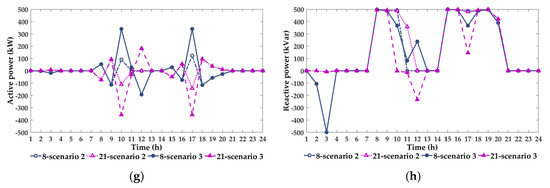 (a) Operation strategy of the active power of SOP integrated at nodes 12 and 22. (b) Operation strategy of the reactive power of SOP integrated at nodes 12 and 22. (c) Operation strategy of the active power of SOP integrated at nodes 25 and 29. (d) Operation strategy of the reactive power of SOP integrated at nodes 25 and 29. (e) Operation strategy of the active power of SOP integrated at nodes 18 and 33. (f) Operation strategy of the reactive power of SOP integrated at nodes 18 and 33. (g) Operation strategy of the active power of SOP integrated at nodes 8 and 21. (h) Operation strategy of the reactive power of SOP integrated at nodes 8 and 21.