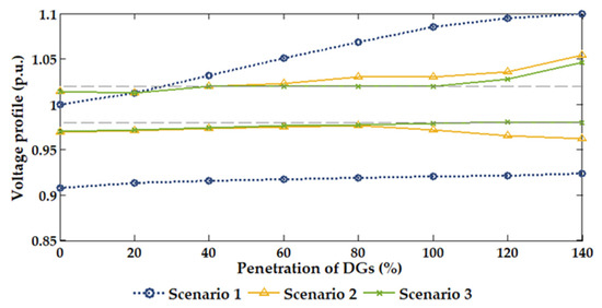 In this section, the DG penetration was varied from 0 to 140% to show the role and performance of inter-area coordination in decentralized control. The power factors of the DGs were all set to 1.0. Scenarios 1, 2, and 3 designed above were adopted in this section.