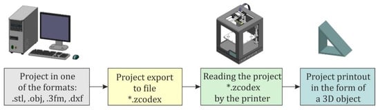 The studies used the M200 Plus printer by ZORTRAX. It is a printer based on the ME3DP (Material Extrusion 3D Printing) technology that uses thermoplastic material in the production process, i.e., molten plastic is used to form object shapes at high temperatures. The models printed using this technology are created by applying the individual layers of semi-liquid material extruded from the heated nozzle. The material is a vein of constant diameter (1.75 mm or 2.85 mm) wound onto a spool, commonly known as a filament.