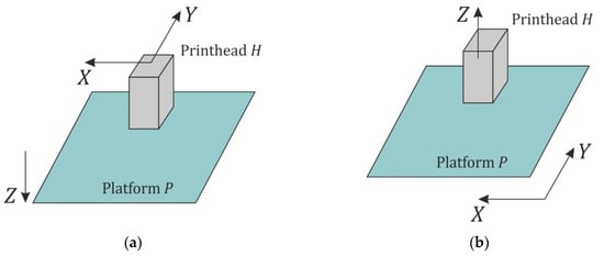 Printhead (H) and platform (P) positioning method. (a) platform (P) movement in the Z axis, (b) platform (P) movement in the X and Y axes.