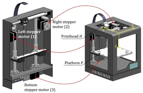 Due to the printhead positioning method, there are at least two types of ME3DE printers where the head is moved in the X, Y or Z axis by the stepping motors (Figure 2). The manufactures have used two solutions that provide a set 3D printout. The first solution concerns control of the printhead (H) movement in the X and Y axes and platform (P) movement in the Z axis (Figure 2a). The other solution includes the platform movement in the X and Y axes and the printhead movement in the Z axis (Figure 2b). The printhead of the tested 3D printer is positioned in the X and Y axes.