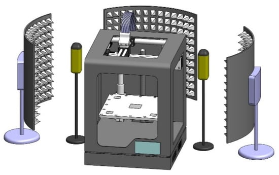Figure 3 shows the overall view of the tested 3D printer. The signals were recorded next to each stepper motor. The recorded acoustic signals were analysed with Audacity. The sampling frequency was 48,000 Hz, the sound was recorded with the Behringer C-1U microphone. In addition, sound-absorbing guards were used to reduce the acoustic signals from the room where the measurements were performed (Figure 4).