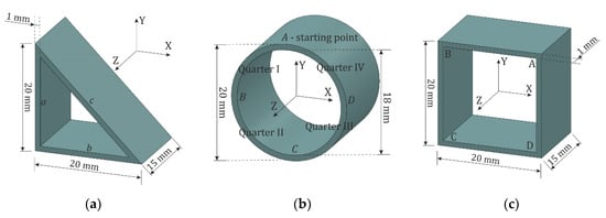 The objects printed during 3D printer tests: (a) trihedron, (b) tube, (c) tetrahedron.