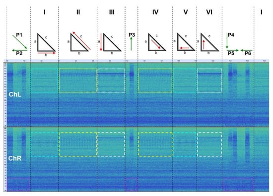 The dark vertical stripes across the spectrum width (Figure 6) refer to the idle speed of printhead (without printing) during P1, P2, P3, P4, P5 and P6. The printhead is moving in the directions indicated by the green arrows. The spectrum density from a few hertz to approx. 4 kHz, marked on the spectrogram with pink rectangles, indicates the platform movement.