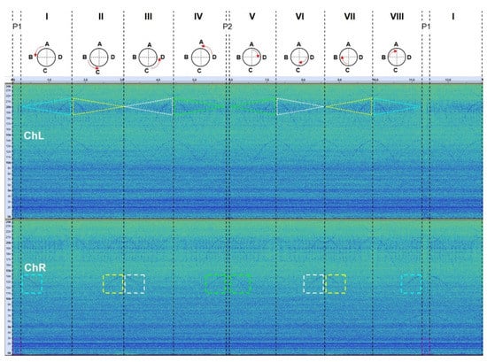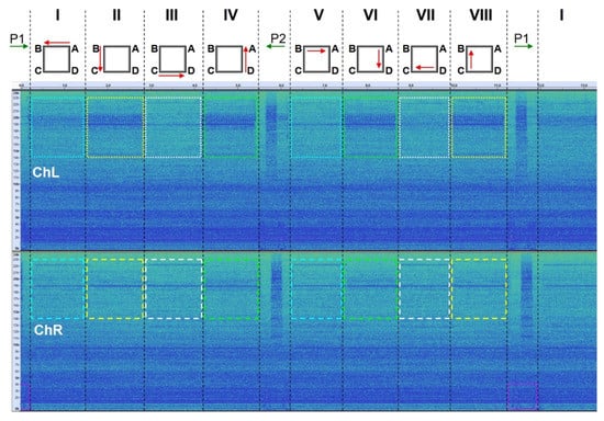 One can observe that the spectrum densities within 19 kHz and 21 kHz for the L channel (left motor) are correlated for the respective printing steps as indicated with the colour triangles in the spectrogram. Step I and VIII (blue triangle), step II and VII (yellow triangle), step II and VI (white triangle) and step IV and V (green triangle) are the mirror reflection of each other in the graphical representation of the spectrum density of the measured acoustic signal. This is due to the fact that during these two step pairs the same arc quarters are printed but the printhead faces the reversed directions. Additionally, the printhead movement trajectory during steps I–IV includes the outer path of the printed wall and during steps V–VII – the inner path.