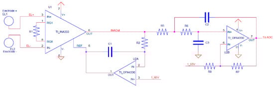 The ECG front-end schematic is shown in Figure 6. It consists of an instrumentation amplifier, which is directly connected to the electrodes, and two op-amps used as HP, and LP filters. The heart of the front-end is the instrumentation amplifier, implemented with the INA333 [32], from Texas Instruments, which has a very low power consumption of 150 μW, a CMRR higher than 100 dB, and a built-in RFI filter. Furthermore, its relatively high resistance to ESD—4 kV HBM and 1 kV CDM—allow to avoid the use of an ESD suppressor. An OPA4330 op-amp [33] has been chosen because of its low power consumption and high price-to-performance ratio.