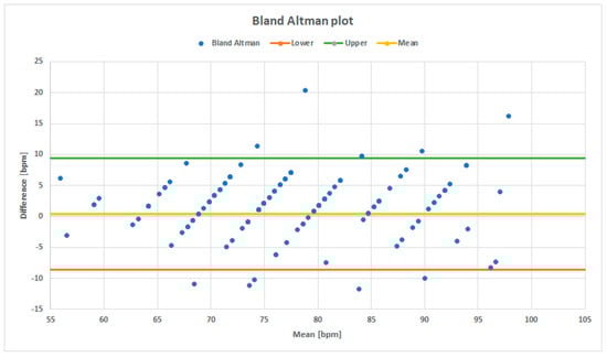 The first parameter that was taken into account in order to compare VITAL-ECG and MAC2000 ECG’s quality is the heart-rate estimation through a Bland–Altman plot. Bland–Altman plots are normally used to compare two measurement systems by plotting differences between the same measurement in the ordinate, and its average on the abscissa.