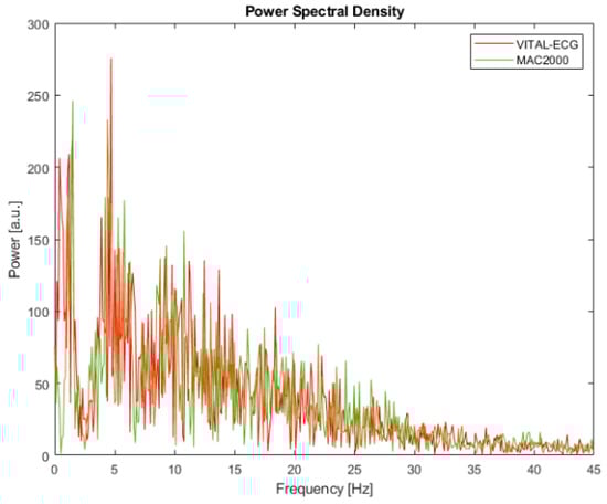 Results of the PSD are shown in Figure 8, where the red line represents the VITAL-ECG and the green line represents the MAC2000.
