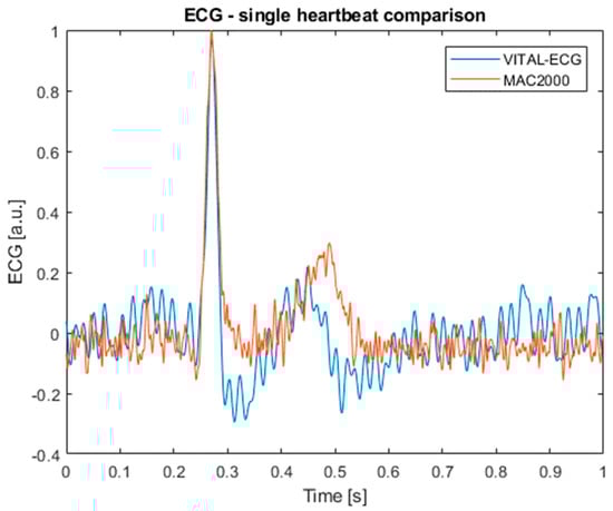 The last comparison between the VITAL-ECG and MAC2000 is in the time domain. For this analysis, a set of various single heartbeats has been built from random subjects in order to evaluate point-to-point differences between the measurement systems. For this purpose, the contemporary acquired signals from the MAC2000 and VITAL-ECG were first normalized, then matching heartbeats were isolated and compared in couples. Figure 9 shows an example of the heartbeat acquired with both the VITAL-ECG (in blue) and MAC2000 (in red).