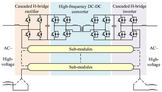 In recent years, with the rapid development of power semiconductor devices and power electronic technologies, the transformer-less cascaded multilevel converter (TCMC) has attracted extensive attention in the medium and high voltage application [1,2,3,4,5,6,7]. As shown in Figure 1, by employing the cascade H-bridge (CHB) converter as the front (last) stage, and the high-frequency isolated bidirectional DC-DC converter as the DC/DC stage, the TCMC can not only remove the bulky and expensive line-frequency transformer, but can also be connected directly to the medium/high voltage power grid and suited for the bidirectional power flow applications, such as coal mine hoists and locomotive traction, with some features as small size and light weight.