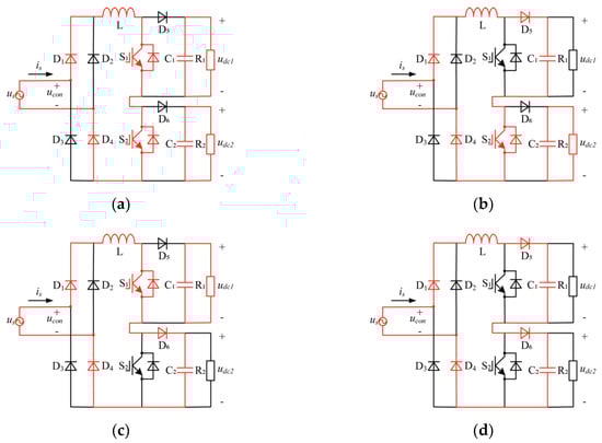 S=1 is defined as the status when the fully-controlled power switch is turn-on, while S=0 is turn-off, and for two switches (S1, S2), there are four modes during the operation of the circuit, namely (1,1), (0,1), (1,0), (0,0). Because the positive and negative half cycles of the power supply voltage are symmetrical, only the positive half cycle is analyzed, and the current path of the four operation modes in the positive half period of AC voltage are shown in Figure 3.