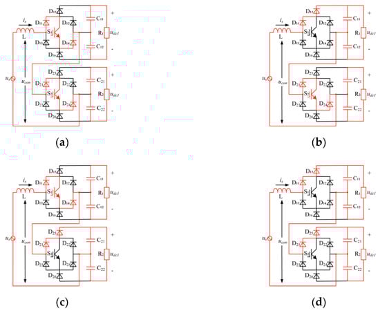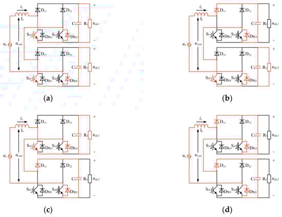 Since the cascaded H-bridge rectifier has already been a focus that attracts many scholars’ attention and adopted in many practical applications [13,14,15,16], it will not be discussed in this section. Instead, the single-phase cascaded rectifiers with two modules in cascading will be taken as an example, and the structures and operation principles of the three types of unidirectional rectifiers will be analyzed.