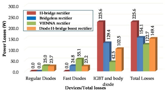 From the graph above, it can be seen that the input diode bridge accounts for a part of the total losses among the cascaded VIENNA and diode H-bridge cascaded boost rectifiers, since the forward voltage drop of the diode bridge causes high conduction losses. Since the cascaded VIENNA rectifier has the lowest losses, due to the topological characteristics of the VIENNA rectifier, those semiconductor devices share only half of the DC bus voltage. The cascaded bridgeless rectifier and the cascaded H-bridge rectifier do not sustain the losses of diode bridge, while they have more fully-controlled switches, and the cascaded H-bridge rectifier has the largest losses. In light of the description of the previous section, the cascaded bridgeless rectifiers reduce half of the fully-controlled switches compared to cascaded H-bridges rectifiers, and the total losses are 31.7% lower than that of the cascaded H-bridge rectifier, and it also has proved that the use of fewer fully-controlled switches can do reduce the losses.