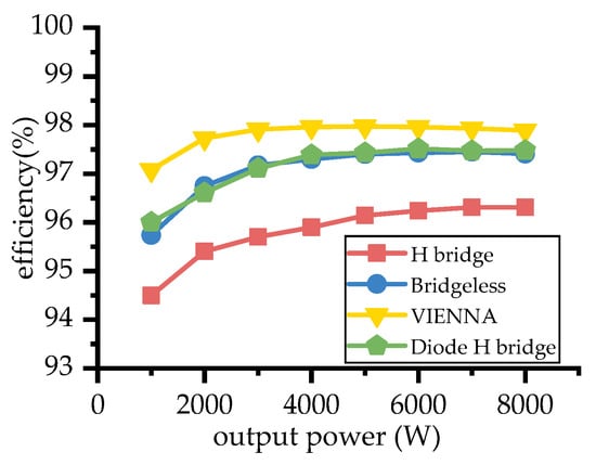 The efficiency measurement is shown in Figure 9, which illustrates the efficiency of the four topologies at different load.