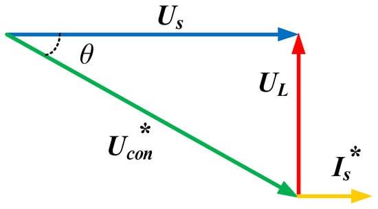 Figure 12 shows the AC side phasor diagram under unity power factor for the unidirectional rectifiers. The input voltage us is in phase with input voltage is, the voltage across the inductance uL is orthogonal to is. According to the vector addition, the AC side reference voltage u*con lags the is by θ. Therefore, the u*con needs to be opposite to is during the period of θ as depicted in Figure 13. However, due to the unidirectional power flow, the polarity of input current is should be the identical to the AC voltage ucon, so ucon can only generate a zero AC voltage during the period of θ. After u*con changes from negative to positive, is can follow i*s after a period of γ [12,27]. The distortions of the input current will become more severe while the leading or lagging angle is increased, so the controllability angle for unidirectional rectifier is limited.