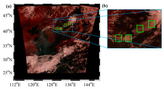 Setting dataset areas in a Geostationary Ocean Color Imager (GOCI) image. Image is composited with an RGB composition (R-8, G-2, B-1): (a) land, cloud, seafog and oceans have colors red, bright pink, dark pink, and black, respectively; (b) green squares are the areas of sea fog dataset extraction, with a size of 100 × 100 pixels.