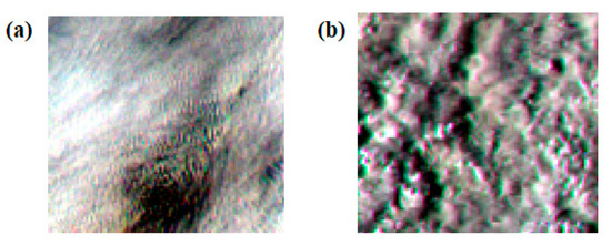 Representative images for sea fog and clouds: (a) sea fog has a fine texture; (b) cloud has a coarse surface texture. These two images have RGB composition (R-6, G-4, B-2) to show texture differences, while Figure 1 shows color difference.
