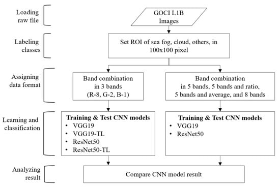 The 3-bands images were used here which can be recognized by transfer learning. The other combinations were not available for transfer learning because ImageNet does not support images over 3 bands. The overall process of sea fog identification is described in Figure 3.