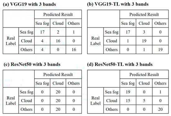 Confusion matrix of sea fog, cloud, and others for CNN models with 3-bands images: (a,b) show that VGG 19 has high accuracy of identification; (c) represents that ResNet50 is not stable because the model was not trained enough with its small number of training datasets; (d) shows TL enhances the identification performance of the ResNet50 model.