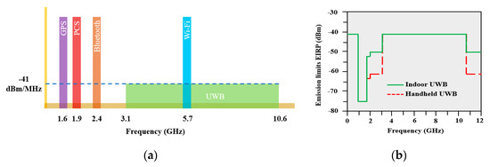Ultra-Wideband (UWB) systems are widely used in short-distance wireless ranging, positioning and data transfer based on their features of low power, high speed, and high security. The bandwidth of a UWB standard system is 7.5 GHz covering the 3.1 to 10.6 GHz frequency range, while a data rate up to 500 Mb/s can be achieved. The signal power is extremely low as −41 dBm over the whole spectrum range (as shown in Figure 1); therefore, the UWB system is difficult to intercept, and interference on other wireless systems caused by UWB signals is also very low [1]. UWB techniques show large potential in next-generation communication scenarios, such as smart wearable devices, ranging and positioning for intelligent logistics and factories, and next-generation high-speed personal area networks (WPANs). Especially, UWB technology is commonly used in indoor positioning in order to present enhancements in terms of achieving high resolution and accuracy, low probability of interception, multipath immunity, and the ability to combine positioning and data communication in one system. Localization systems based on UWB technology achieve an accuracy of centimeters. In the UWB-based positioning system, interference with the ultra-wide spectrum may occur because of the misconfiguration. Interference may occur also due to the spread of the UWB signal over the bandwidths containing the frequency of the existing narrowband system [2]. Therefore, the UWB filter is a key component of indoor UWB positioning systems to remove interference and improve position accuracy. For these applications, the wireless circuit systems tend to be of high performance, low cost, and compact size to meet the requirements of next-generation portable and miniaturized devices. Then, the System in Package (SiP) solution is highly adopted due to its high integrated level; the passive and active circuit blocks are then realized as integrated circuit (IC) chips and mounted together with bonding wires in SiPs, including filters that are used to select the passband signal.