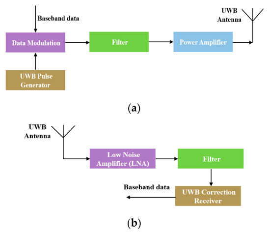 The typical transmitter and receiver block diagrams are shown in Figure 2 [1]. At the transmitter end, a pulse signal is generated by the UWB pulse generator and then directly modulated with the input baseband data; a UWB bandpass filter is followingly used to put through the passband signal and reject the stopband signal before the signal is transmitted through the power amplifier and UWB antenna. At the receiver end, the signal is amplified to increase the amplitude range with a low-noise amplifier (LNA); then, another UWB bandpass filter is used to select the passband signal from the LNA, and the output baseband signal is finally received after the correction receiver.