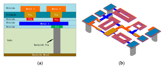 The proposed filter is designed and fabricated using a commercial 0.25 μm GaAs pHEMT technology, which is the mainstream technology to implement low-noise amplifiers, power amplifiers, and switches of RF front-ends for wireless communication systems. The passive devices based on this technology tend to have similar performance as they are designed on a GaAs IPD by the reason of the same GaAs substrate, nitride dielectric layers, and gold metal layers. A bandpass chip filter realized with this process has the potential to be easily integrated within the RF SiP systems. The simplified layer structure on a GaAs substrate with nitride dielectric layers is shown in Figure 1a. Only the passive dielectric layers and metal layers are used to implement this filter, so the active device layers are ignored in this design. There are two metal layers (M1 and M2), which are gold. The metal layers are insulated by several nitride dielectric layers and a polymide dielectric layer. The thickness of M1 is 1 μm, and M2 is a thick metal with an optional thickness (2 μm or 4 μm). A 4 μm thickness is chosen for M2 in this design to enhance the power-handling capacity of inductors and reduce the metal loss of metal lines, inductors, and conductors. Layers M1 and M2 are connected by the metallization backside via holes. The second nitride layer is adopted to form the MIM capacitor. The inductor is realized by the spiral structure composed of M1 and M2.