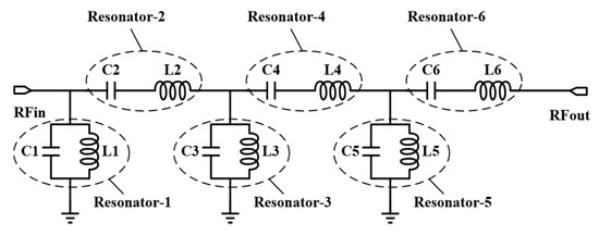 Chebyshev filters are traditionally used for LC resonator-type filters due to its features of a flat passband response, good stopband, rejection, and simple structure. A sixth-order Chebyshev filter is shown in Figure 4. This traditional Chebyshev filter is composed of six LC resonator sections. The odder resonators 1,3,5 are constructed by shunt LC networks, and the even resonators 2,4,6 are constructed by series LC networks. These shunt and series LC resonators are serially connected to form a six-order filter structure, which can be used to implement the broadband UWB filter.