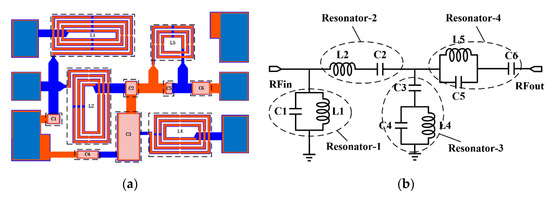 A modified Chebyshev filter is proposed in this work to improve the stopband rejection and reduce the size of the UWB filter. The 2D layout topology of this filter is shown in Figure 5a, and the circuit model is shown in Figure 5b. The proposed filter is composed of four LC resonator sections. Resonator-1 and resonator-2 are a shunt LC network and series LC network, respectively, which is the same as that in the traditional Chebyshev filter to ensure two poles for the passband response. Two modified LC resonator network resonators—3 and 4—are introduced in the proposed filter. Both of them are composed of a shunt LC network in serial with a capacitor. The total number of lumped elements in this novel filter is 10, including four inductors and six capacitors, as shown in Figure 5, which is two elements less compared with the traditional Chebyshev filter in Figure 4. Especially, two large inductors L5 and L6 in Figure 4 are removed in this novel filter. Consequently, this modified Chebyshev filter is much more compact compared with the traditional Chebyshev filter; therefore, it is more suitable to realize the small on-chip filter for UWB systems. On the other hand, the proposed filter shows improved stopband rejection properties since two additional zeros are introduced by the modified resonator-3 and resonator-4, which will be analyzed in detail in the following sections.
