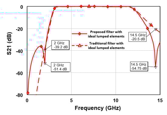 The S21 response of the proposed and traditional filter are both simulated as shown in Figure 7. The passband frequency range is from 3 to 11 GHz, the passband insertion loss is almost 0 dB, since all of the inductors and capacitors used are ideal lumped elements. Figure 7 shows that a zero-frequency point of the proposed filter is introduced at a 2 GHz low stopband frequency point, and another zero point is introduced at a 14.5 GHz high-frequency point. These simulated zero points matched very well with the calculated results from Equation (7), which are 1.97 GHz and 14.53 GHz, respectively. The rejection of the proposed filter at 2 GHz is −51.4 dB, while that of the traditional filter is only −39.2dB, which shows a −12.2 dB improvement of rejection at 2 GHz with this novel UWB filter. The rejection of the proposed filter at 14.5 GHz is −54.7 dB, while that of the traditional filter is only −20.5 dB, which shows a −34.2 dB improvement of rejection at 14.5 GHz with this novel UWB filter. It demonstrated that the proposed filter not only has the compact size advantage with the reduction of two inductors, but also shows improved stopband rejection at the adjacent frequency band. The trade-off sacrifice of this proposed filter is that it shows weaker rejection at the frequencies lower than 1.9 GHz. These frequencies are relatively far from the UWB operation band, so that the interference shows less effect on the UWB system. On the other hand, the rejection at these frequencies are all lower than –36 dB, which means the rejection is good enough to satisfy UWB filtering applications.