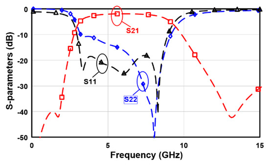 To further demonstrate the advantage and performance of the proposed filter, it is designed on a 0.25 um GaAs pHEMT process. The 3D and top-view layout structures are illustrated in Figure 3b and Figure 5a. The inductors in the circuit model are designed as lumped spiral inductors in the layout. The capacitors are designed as plate capacitors, and they are connected by metal layers M1 and M2; the dielectric for capacitors is the nitride layer. An EM simulation is performed to relatively accurately predict the transfer performance of the proposed filter by calculating the parasitic effect of the material and devices. The simulated S parameters of the proposed filter are shown in Figure 8. The passband insertion loss S21 of the proposed filter is about 1.5 dB, which was mainly introduced by the substrate loss and metal parasitic resistance. The frequency range of the passband is from 3.1 GHz to 9.0 GHz, which is 2 GHz less compared with that of the filter using ideal elements. The reason of the high-frequency S21 degradation is mainly caused by the GaAs process we adopted, which has a cut-off frequency of only 29.5 GHz. Therefore, the inductors and capacitors on this GaAs substrate show strong self-resonance behavior when operation frequencies exceed 10 GHz. However, the 3.1–9.0 GHz passband covering range is sufficient in real UWB application, since the bandwidth of the UWB signal pulse is normally covered in this range. A zero point at 1.75 GHz with −42 dB rejection is introduced as shown in Figure 8, and another zero point is at 13 GHz with −42 dB rejection. The return loss S11 is lower than −18 dB, and S22 is lower than −10 dB during the whole operation frequency.