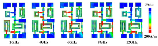 The current distributions of the proposed filter at frequencies of 2 GHz, 4 GHz, 6 GHz, 8 GHz, and 12 GHz are simulated and illustrated in Figure 9. The normalized current density is 200 A/m. It shows that at the 4 GHz, 6 GHz and 8 GHz passband frequencies, the current is well transferred to the output. At the 2 GHz and 12 GHz stopband frequencies, the current is constrained in the zero resonators and reflected back to the input, so that the signal transfer through this filter is rejected at these frequencies. Therefore, the proposed filter shows the capacity of letting the passband signals go through the device and rejecting the stopband signals. Consequently, a compact chip filter for UWB systems with low loss and high selectivity is well designed and optimized.