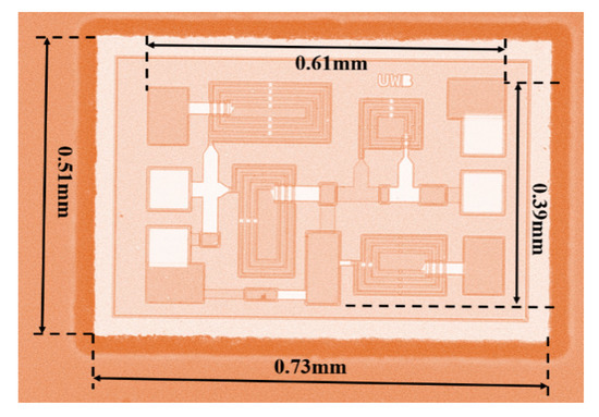 The proposed filter is finally fabricated on a 0.25 um GaAs pHEMT process; the chip photo is shown in Figure 10. All the six capacitors are small with little chip area consumption, and there are only four inductors remained in the proposed filter to furtherly reduce the chip size. Finally, a very compact filter chip size of 0.73 mm × 0.51 mm is achieved including chip edge and scribe line area, and the filter core area is only 0.61 mm × 0.39 mm including bonding PADs.