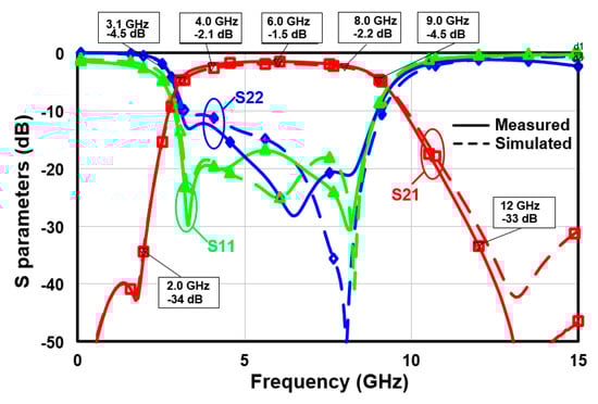 The proposed UWB chip filter is measured on an RF probe station to avoid the parasitic effects introduced by the packaging, circuit board, or connection wires. S parameters are measured for the proposed filter, whose amplitudes are compared with the simulation results as shown in Figure 11. The measured insertion loss S21 is well matched with the simulated results, the minimum insertion loss in the passband is only 1.5 dB, and the 3-dB passband bandwidth is from 3.1 to 9.0 GHz. For the stopband performance, two zeros are realized at the 1.75 GHz and 13.5 GHz frequency points, while the rejection at 2 GHz is up to −34 dB, and it is −33 dB at 12 GHz. Two matching frequency points of S11 match well with the simulated results, and the measured S11 is lower than -16 dB during the whole passband. The matching frequency point of S22 shifts about 2 GHz to the lower frequency end compared with the simulated results, which is mainly because of the parasitic effects and inter-device coupling of the shunt–series LC network of resonator-3 and resonator-4 at high frequencies. The measured S22 is lower than −11 dB during the whole passband.