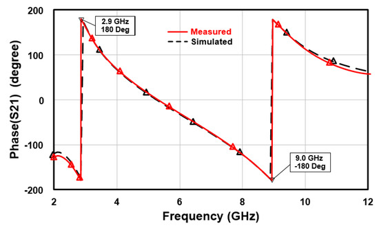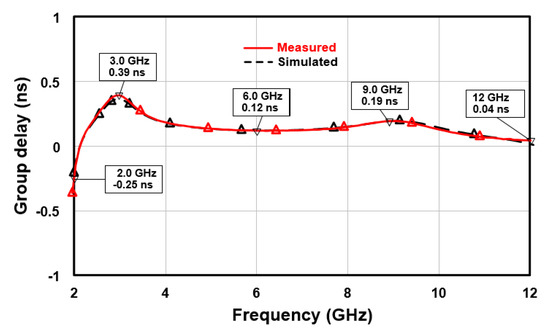 The phase response of S21 is measured for the proposed filter, which is compared with the simulation result as shown in Figure 12. It shows that the phase response of S21 changes linearly during the whole 2.9–9.0 GHz frequency band, indicating the small phase distortion of the proposed filter. Group delay is usually used to judge the nonlinear distortion of a filter. If a group delay ripple is large during the passband, then the signal transmit time through the device shows nonlinear variation at different frequencies. The measured and simulated group delay of the proposed filter are compared in Figure 13. The maximum passband group delay is located at 3.0 GHz, which is 0.39 ns. The minimum passband group delay is 0.12 ns at 6 GHz. Therefore, the group delay variation during the whole passband is only 0.27 ns, which is extremely low for such a wideband chip filter.