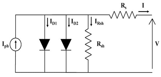 As another configuration to model the PV cell, the double-diode is an improvement of what was claimed about the single-diode accuracy []. Recently, the DDM has become a primary solution for several authors due to its improvements especially at low-irradiances [,]. This model considers two diodes in parallel with the current source as shown in Figure 2, and the output current is given by Equation (3):