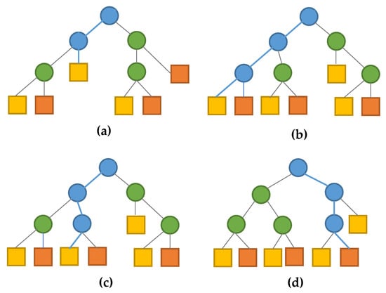The classification tree technique also noted as a decision tree is one of the common approaches applied in data mining to predict the class response for a given observation by using specific predictor variables []. The classification tree learning maps the observations as a tree structure to model its target value []. In the tree, each node represents a feature and each path corresponds to what is associated. The decision tree learner can identify each node that classifies the best value of the feature within the dataset according to some criterion. The terminal nodes are marked according to the classes into which the instances are to be classified. During the testing, the value of the instance is compared with the value labeled at each path (branch). If the value at the node matches the value of the node then the classification will continue through the path until it meets the terminal node as shown in Figure 3 []. The terminal leaf nodes are shown as orange and yellow squares according to the classes. In each tree, the instance is shown in a blue path. In Figure 3a–c the tree predicts the yellow class, unlike in Figure 3d the instance is in the orange class, so the classifier will assign it to the yellow class by a 3 to 1 majority voting.