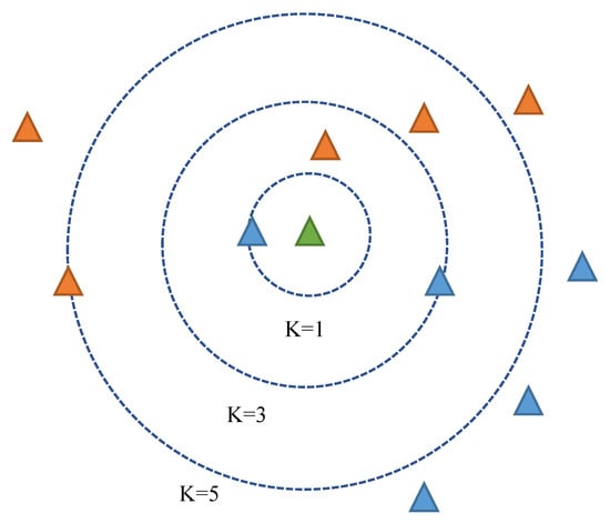 The k-nearest neighbors algorithm (kNN) is a ML method applied for classification where an instance represents a point in a d-dimensional space and each dimension corresponds to one of the d features. So, the instances which present the same properties would be close to each other in the d-dimensional space []. In order to predict the class, the kNN algorithm finds k nearest instances by computing the distance between them. The predicted class is represented by the minimum distance among instances. The Euclidean distance is usually applied as the distance metric [,]. The k-nearest neighbor classification algorithm is listed in Appendix A. Figure 4 shows the kNN classification concept. The green instance will be assigned to the blue class for k = 1. For k = 3 it will be classified as the blue class by a 2 to 1 majority and finally, it will be assigned to the orange class by 3 to 2 cases for k = 5. Therefore, the k-nearest-neighbors classifier assigns to a test sample the majority class of its k-nearest training samples.