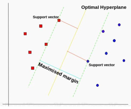 Support vector machines are supervised learning models able to analyze data and learn a classifier []. An SVM finds the optimal separating hyperplane as a decision surface to separate the data in different classes. First, the SVM method transforms predictors to high-dimensional feature space and successively solves a quadratic optimization problem to find an optimal hyperplane in order to classify the transformed features into classes [].