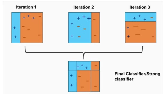 A classification ensemble combines different machine learning techniques models to improve the model performance by decreasing variance (bagging), bias (boosting), or improving predictions (stacking) []. One of the most popular ensembles learning algorithms is adaptive boosting (AdaBoost) that uses the boosting method to convert weak learners to strong learners []. Given a dataset of N data points, the AdaBoost algorithm firstly initializes the weights for each data point. Then it fits weak classifiers to the data set and selects the one with the lowest weighted classification error. For each iteration, it computes the weight for each weak classifier related to each data point. The final classifier can be expressed as:
