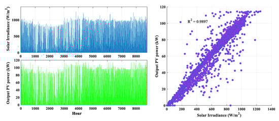 Figure 7 shows the hourly solar irradiance incident on the plane of the array and the output power over one year. The hourly output power increases linearly with the increase of solar irradiance on the tilted plane with a strong correlation (R2 = 0.9897).