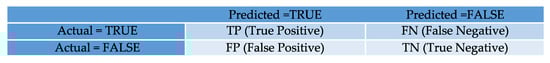 A further tool to present the classification algorithm performance is the confusion matrix, noted also as an error matrix. The matrix includes the predicted true/false values and actual true/false values as shown in Figure 9. The prediction is correct for true positive (TP) and true negative (TN) and prediction fails for false negative (FN) and false positive (FP).