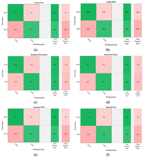 In Figure 11, the cells show the percentage of correct classifications by the trained network. In the case of course tree, 91% of samples are correctly classified as the DDM and similarly, 75% of samples are correctly classified as the SDM. Cubic KNN, Gaussian SVM, and boosted trees show the same trend as the course tree algorithm for TPR. Quadratic discriminant and kernel Naïve Bayes present lower TPR (87%) for thr DDM which means that 13% of samples are incorrectly predicted as a SDM. In the case of SDM class the TPR is higher than the corresponding one of course tree, cubic KNN, Gaussian SVM, and boosted trees (84% for quadratic discriminant and 82% for kernel Naïve Bayes). Therefore, the last two models fail for 16% and 18% of samples, respectively.
