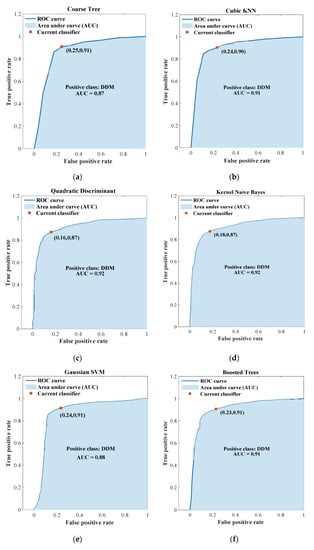 Receiver operating characteristics (ROC) curve for each classification model. (a) Coarse Tree; (b) Cubic KNN; (c) Quadratic Discriminant; (d) Kernel Naïve Bayes; (e) Gaussian SVM; (f) Boosted trees.