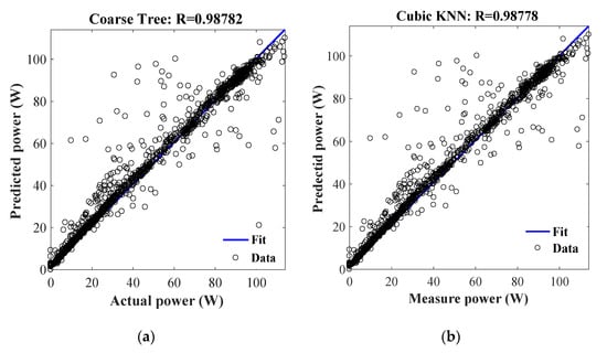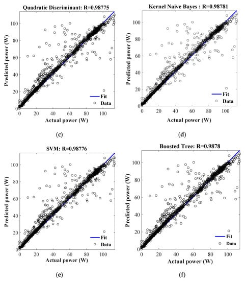 In order to assess the performance of the classification algorithms in terms of PV power output predicted, a test dataset related to the months of February, May, August, and November was chosen for a total of 2880 samples. Figure 13 shows the linear regression of actual power (targets) relative to predicted power (outputs). High R values demonstrate that the ML classification algorithms are very suitable to predict the output power based on the hybrid modeling between SDM and DDM.